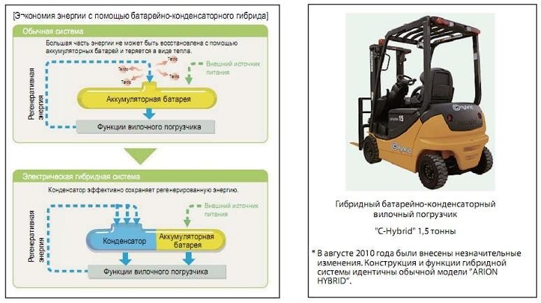 Для решения этой проблемы концерн Komatsu Utility Go. Ltd., Япония, разработал и внедрил в производство батарейно-конденсаторные вилочные электрические погрузчики 1-тонного и 2-тонного классов. В дополнение к аккумуляторным батареям стандартной модели гибридный электропогрузчик включает конденсатор для хранения электроэнергии, комбинируя преимущества двух источников питания.